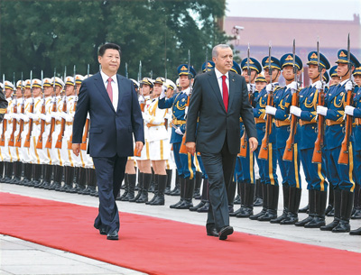 会谈前,习近平在人民大会堂东门外广场为埃尔多安举行欢迎仪式。习近平主席夫人彭丽媛,全国人大常委会副委员长陈昌智,国务委员杨洁篪,国务委员、公安部部长郭声琨,全国政协副主席罗富和等出席。