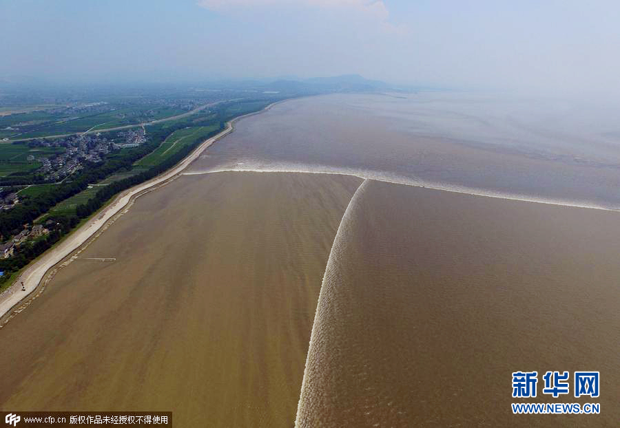 2015年08月02日,浙江海宁,钱塘江东潮和南潮出现在江面上,形成人字交叉潮。海宁丁桥新仓段钱塘江,空中俯瞰人字形交叉潮十分壮观。