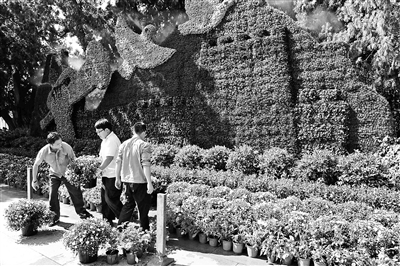 据悉,今年花坛布置工作的难度比往年更大,主要原因是花坛主体造型“长城”全部用植物穿插而成,与过去花篮、灯笼、宫灯等造型相比,用花量更大,造型也更加复杂。今夜明晨,花坛主体造型“长城”将入场,并进行组装。组装完成以后,会在周围搭建脚手架,摆放其他图案。由于今年花卉布置时间比往年提前一个多月,为了保障景观效果,花卉供应商特别分两批培育花卉,把用于九·三阅兵的花卉花期提前。