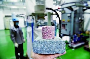 旧钞的碎片,通过钞票处理中心内的管道,直接输送到压块机内,压成一个个红色(100元)柱体和蓝灰色(10元)方砖,确保不能复原。