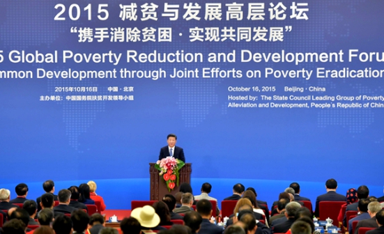 10月16日,2015减贫与发展高层论坛在北京人民大会堂举行。国家主席习近平出席论坛并发表题为《携手消除贫困促进共同发展》的主旨演讲。 新华社记者李涛摄