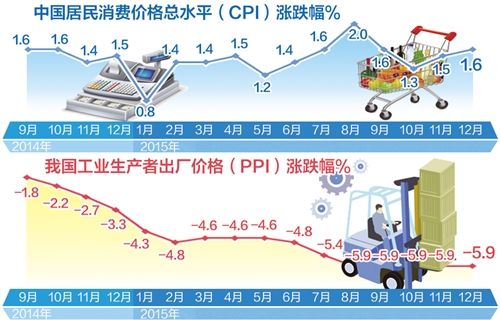 1月9日,国家统计局发布2015年12月份全国居民消费价格指数(CPI)和工业生产者出厂价格指数(PPI)。数据显示,12月份,CPI环比上涨0.5%,同比上涨1.6%;PPI环比下降0.6%,同比下降5.9%。2015年CPI整体比上年上涨1.4%。