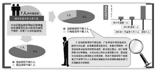 《法制日报》记者统计显示,2014年至今年5月3日,中央纪委监察部网站纪律审查栏目通报党纪处分的党员领导干部中,共有7人涉封建迷信,其中党政领导干部6人,国企领导干部1人。