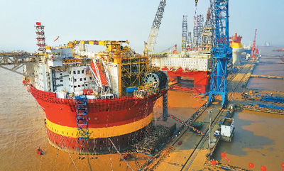 图为二月九日,中国船厂首个为国外完整建造的圆筒型浮式生产储卸油平台总包项目完工开航。 许丛军摄(人民视觉) |