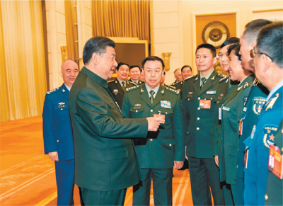 三月十二日,中共中央总书记、国家主席、中央军委主席习近平出席十二届全国人大五次会议解放军代表团全体会议并发表重要讲话。这是会议结束时,习近平亲切接见来自基层部队的部分军队人大代表。 新华社记者 李 刚摄 |