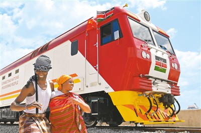 2017年1月11日,在肯尼亚蒙巴萨,当地民众在中国承制的蒙内铁路首批内燃机车旁载歌载舞。 新华社记者 孙瑞博摄 |