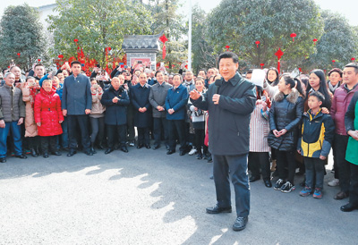 春节在即,村里照全家福、写春联福字、包汤圆等新春民俗活动丰富多彩。习近平每到一处,都驻足同群众交流,他说:“我是人民的勤务员,让人民过上好日子是我们共产党人的初心、宗旨。”临行前,村民们欢呼着簇拥上来向总书记拜年,习近平热情同村民们打招呼,祝乡亲们安逸舒适、新春快乐、阖家幸福。