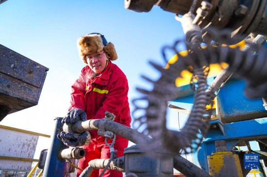 大庆油田1205钻井队钻井工人在野外钻井平台作业(2021年1月7日摄)。新华社记者 王松 摄