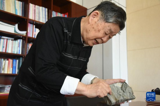 大庆油田第二代“铁人”王启民在办公室手持岩心样本介绍采油技术的发展情况(2021年2月25日摄)。新华社记者 杨喆 摄