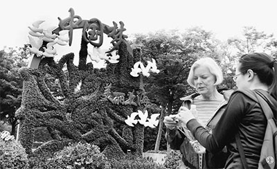 图①:2014年5月17日,上海人民广场上为迎接亚信峰会设立的大型花坛景观吸引中外游客拍照留影。 人民视觉 |